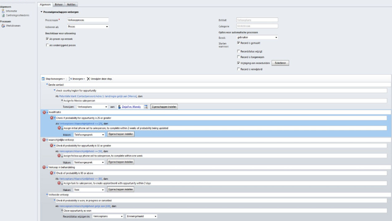 Doorloop stap 2: automatiseren van de werkstroom in CRM Dynamics online. Maak voor de bewijsvoering een schermafdruk van de ingevoerde verkoopswerkstroom.